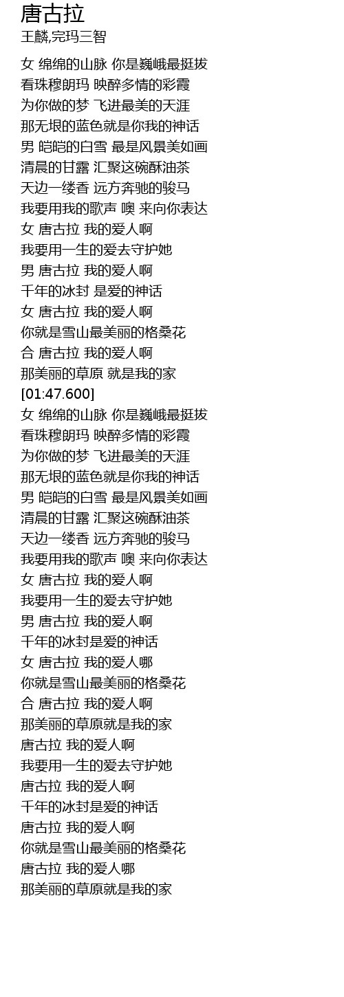 | [01:37.800] | 合 唐古拉 我的爱人啊 |