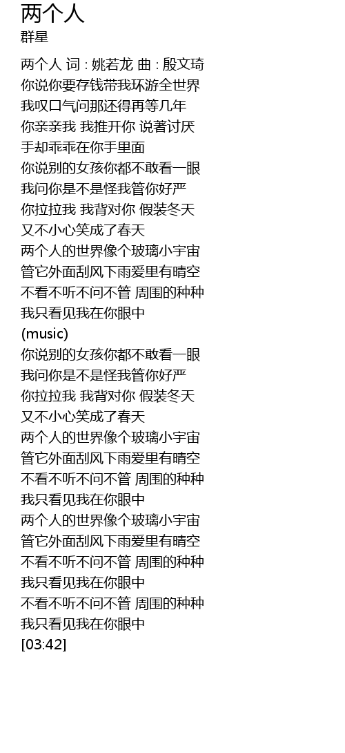 | [00:00] | 两个人 词∶姚若龙 曲∶殷文琦 |
