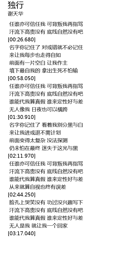 | [00:58.480] | 任谁亦可信任我 可背叛我再指骂 |