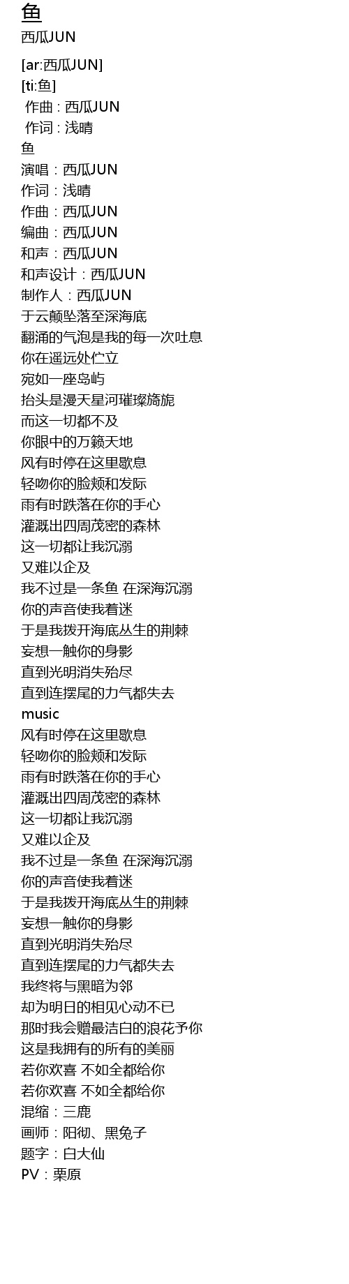 | [02:38.73] | 我不过是一条鱼 在深海沉溺 |