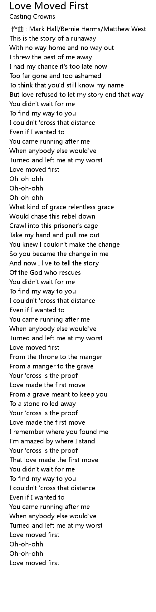 | [00:00.000] | zuo qu : Mark Hall Bernie Herms Matthew West |