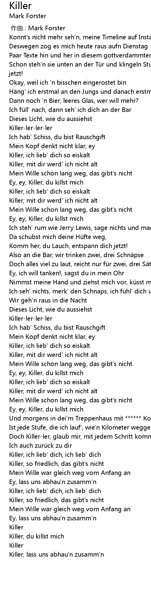 | [02:31.46] | Killer, ich lieb' dich, ich lieb' dich |