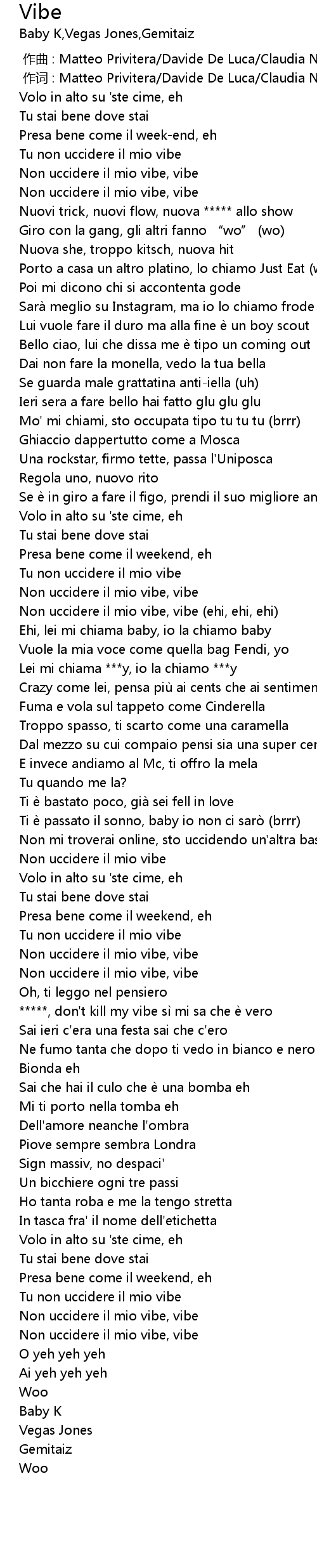 | [01:21.04] | Non uccidere il mio vibe, vibe (ehi, ehi, ehi) |