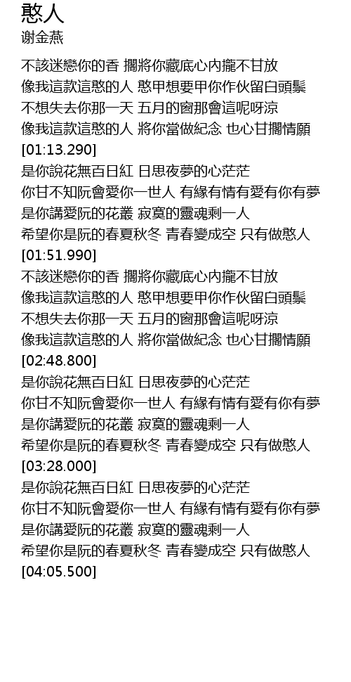 | [03:53.420] | 希望你是阮的春夏秋冬 青春變成空 只有做憨人 |