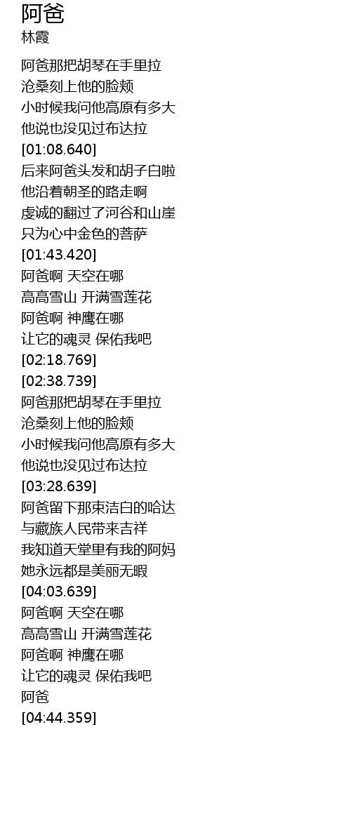 | [03:31.749] | 阿爸留下那束洁白的哈达 |