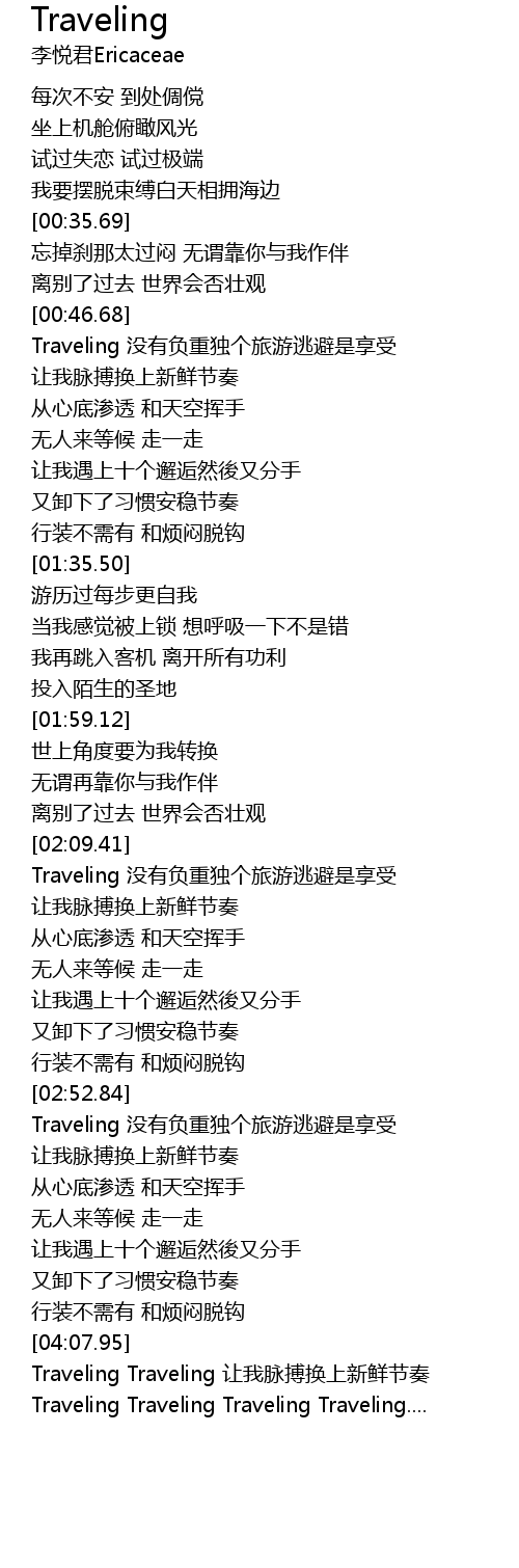 | [04:09.05] | Traveling Traveling 让我脉搏换上新鲜节奏 |