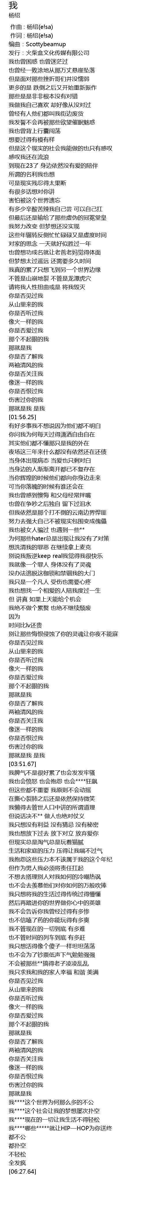 | [04:21.320] | 我也会愤怒 也会抱怨 也会****狂飙 |