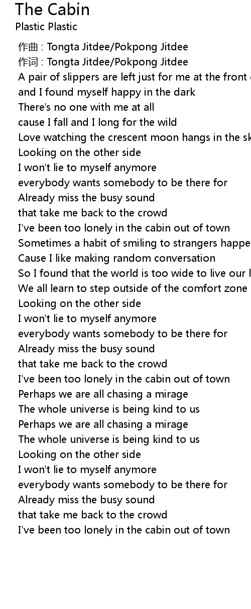 | [01:06.846] | I've been too lonely in the cabin out of town |
