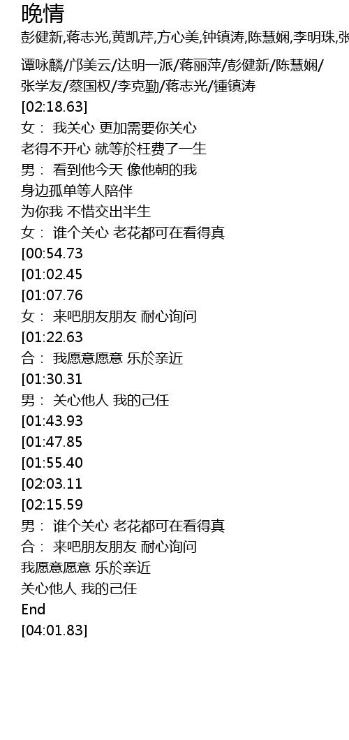 | [00:16.23] | 女: 我关心 更加需要你关心 |