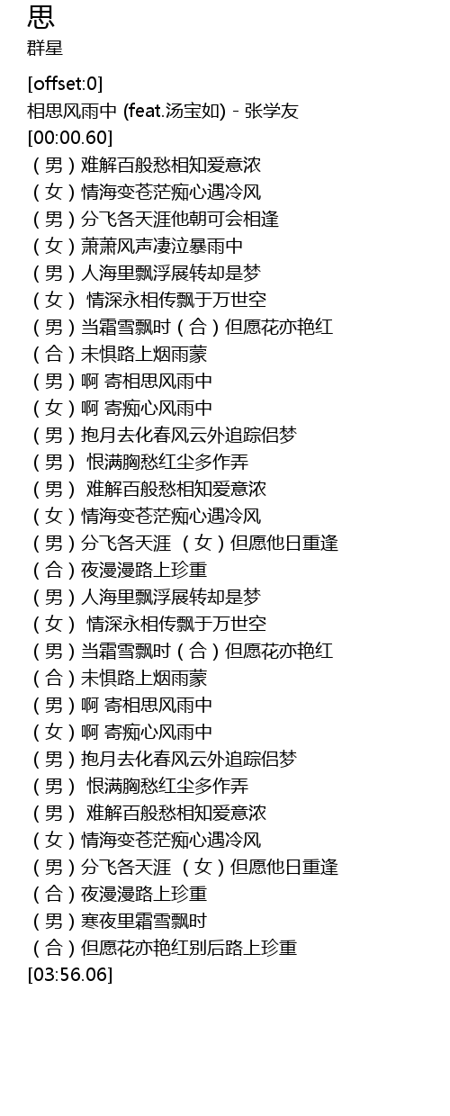 | [00:00.10] | 相思风雨中 (feat.汤宝如) - 张学友 |