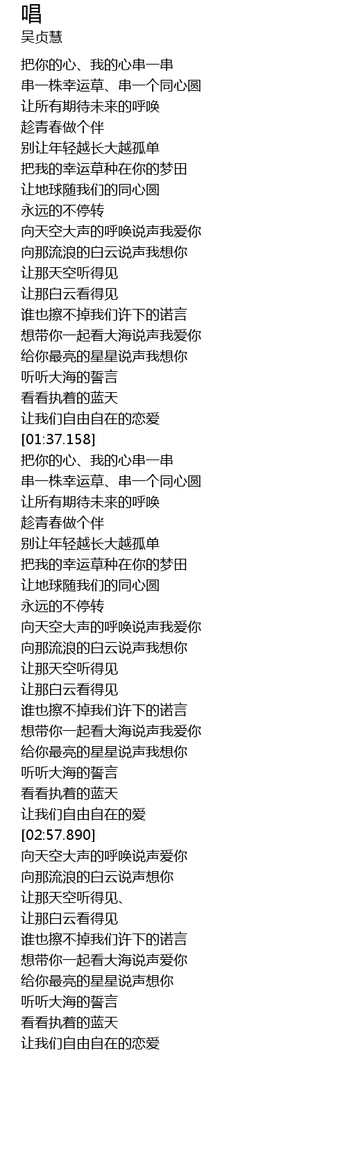 | [01:54.770] | chuàn yī zhū xìng yùn cǎo chuàn yí gè tóng xīn yuán |