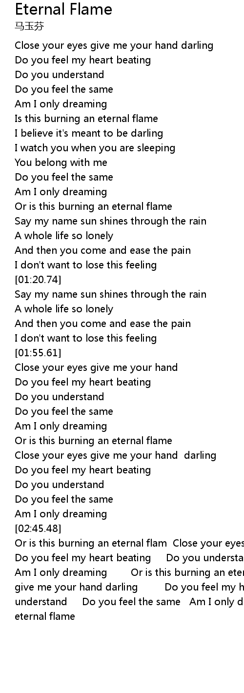 | [02:46.07] | Or is this burning an eternal flam Close your eyes give me your hand Do you feel my heart beating Do you understand Do you feel the same Am I only dreaming Or is this burning an eternal flame Close your eyes give me your hand darling Do you feel my heart beating Do you understand Do you feel the same Am I only dreaming Or is this burning an eternal flame |