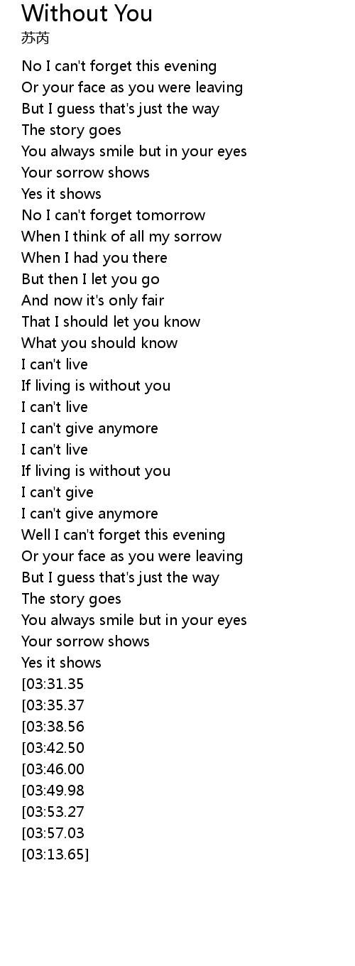 | [04:19.14][03:49.98][02:58.52] | If living is without you |