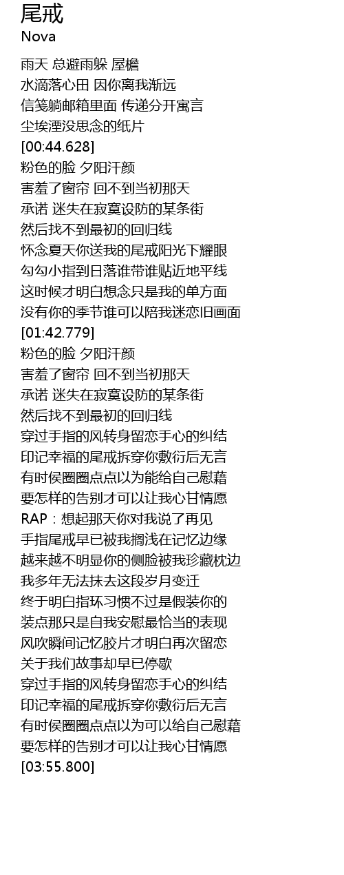| [02:39.400] | 印记幸福的尾戒拆穿你敷衍后无言 |
