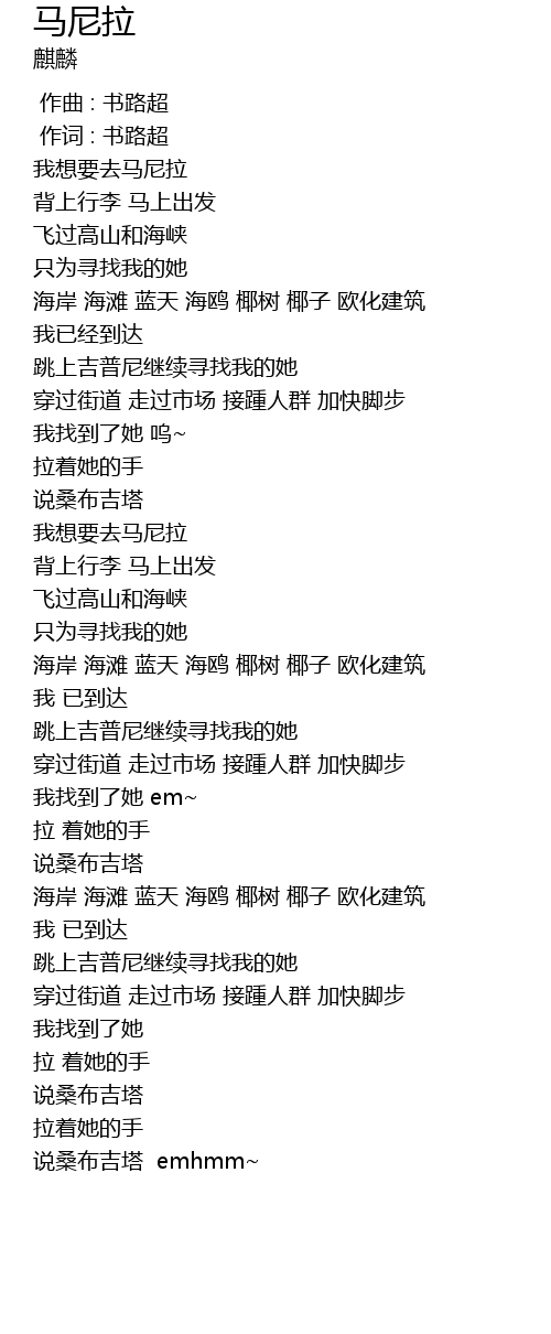 | [01:38.950] | wǒ xiǎng yào qù mǎ ní lā |