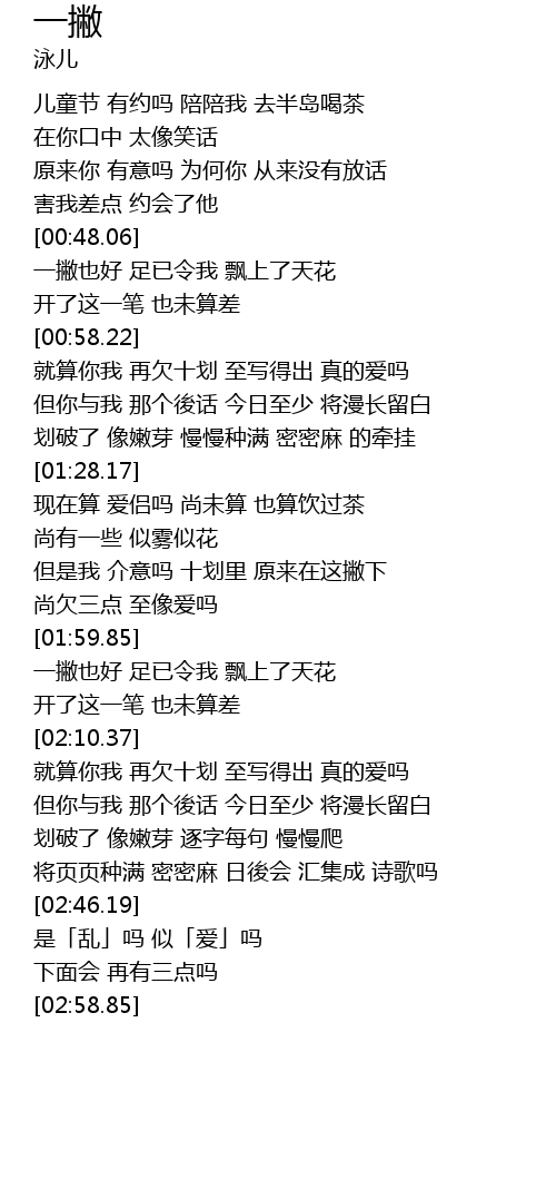 | [02:22.61] | 但你与我 那个後话 今日至少 将漫长留白 |