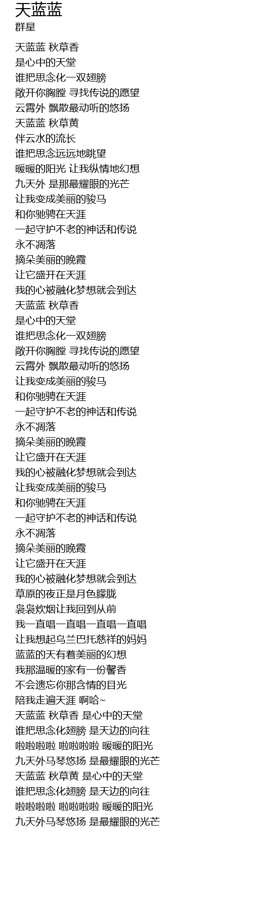 | [00:33.820] | 天蓝蓝 秋草香 |