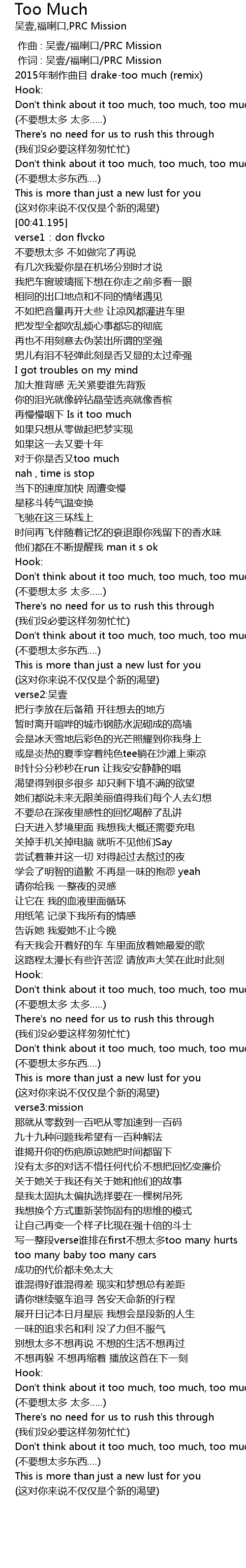 | [03:02.709] | Don' t think about it too much, too much, too much, too much bú yào xiǎng tài duō tài duō.. |