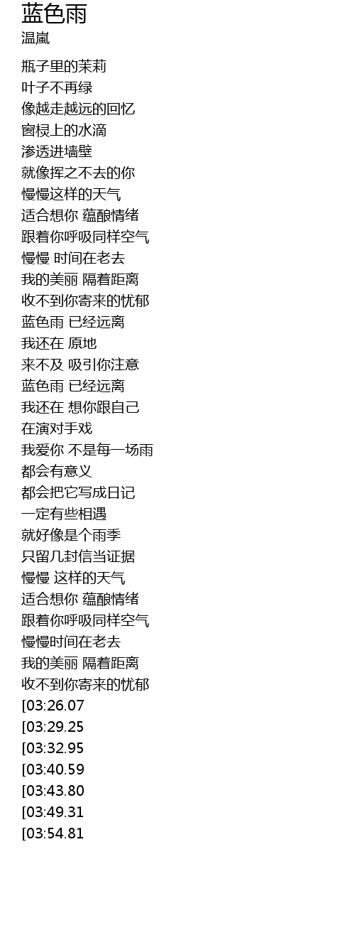 | [04:13.20][03:40.59] | 蓝色雨 已经远离 |