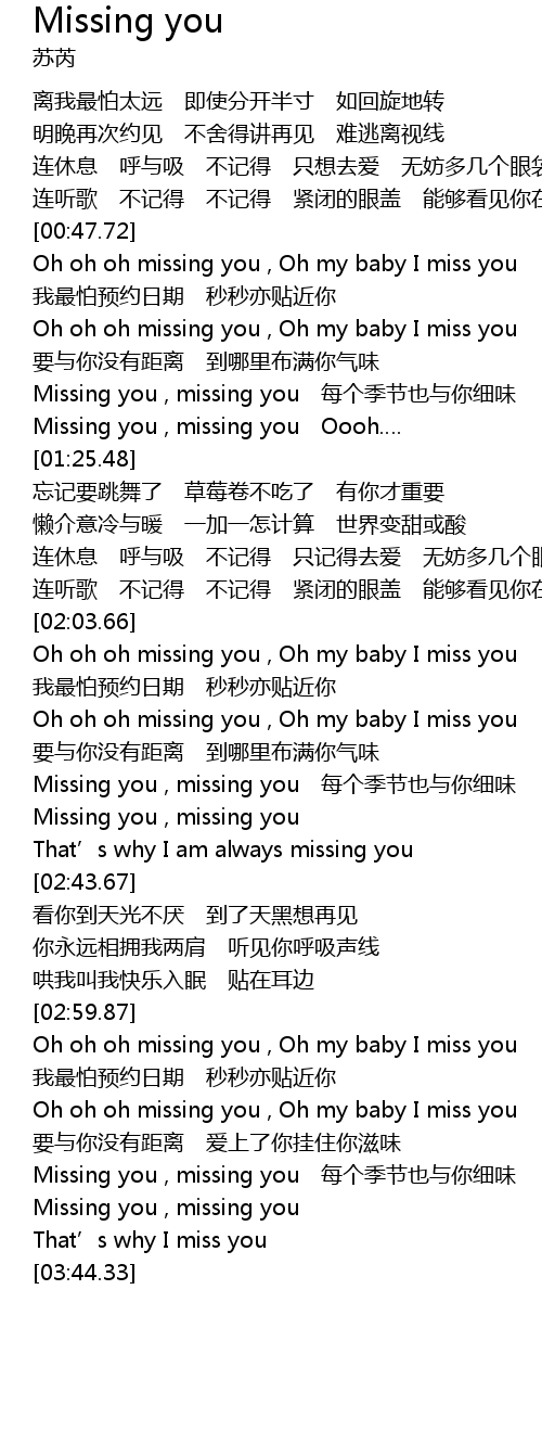 | [02:04.33] | Oh oh oh missing you , Oh my baby I miss you |