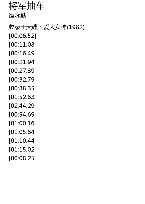 | [02:03.37][00:54.69] | 将军抽车 将军抽车 |