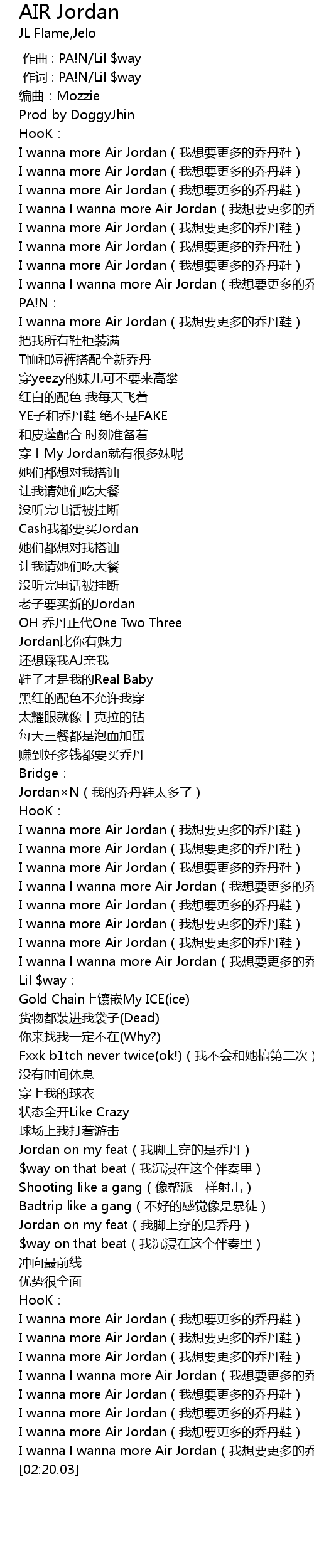 | [00:22.50] | I wanna more Air Jordan(我想要更多的乔丹鞋) |