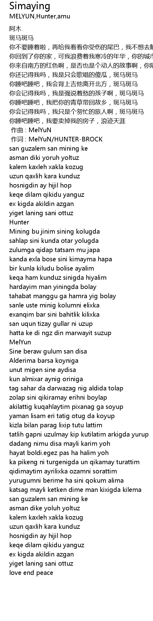 | bān mǎ bān mǎ nǐ bú yào shuì zháo la, zài gěi wǒ kàn kàn nǐ shòu shāng de wěi bā, wǒ bù xiǎng qù chù pèng nǐ shāng kǒu de bā, wǒ zhǐ xiǎng xiān qǐ nǐ de tóu fà, bān mǎ bān mǎ nǐ huí dào le nǐ de jiā, kě wǒ làng fèi zhe wǒ hán lěng de nián huá, nǐ de chéng shì méi yǒu yī shàn mén wèi wǒ dǎ kāi a, wǒ zhōng jiū hái yào huí dào lù shàng, bān mǎ bān mǎ nǐ lái zì nán fāng de hóng sè a, shì fǒu yě shì gè dòng rén de gù shì a, nǐ gé bì de xì zǐ rú guǒ bù néng liú xià, shuí huì hé nǐ shuì dào tiān liàng, bān mǎ bān mǎ nǐ hái jì de wǒ ma, wǒ shì zhǐ huì gē chàng de shǎ guā, bān mǎ bān mǎ nǐ shuì ba shuì ba, wǒ huì bèi shàng jí tā lí kāi běi fāng, bān mǎ bān mǎ nǐ huì jì de wǒ ma, wǒ shì qiáng shuō zhe chóu de hái zi a, bān mǎ bān mǎ nǐ shuì ba shuì ba, wǒ bǎ nǐ de qīng cǎo dài huí gù xiāng, bān mǎ bān mǎ nǐ huì jì de wǒ ma, wǒ zhǐ shì gè cōng máng de lǚ rén a, bān mǎ bān mǎ nǐ shuì ba shuì ba, wǒ yào mài diào wǒ de fáng zi, làng jī tiān yá | |