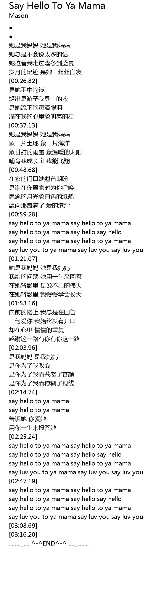 | [02:31.20] | say hello to ya mama say hello say hello |