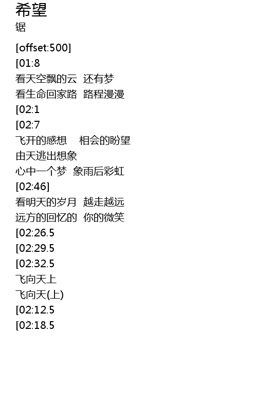 | [01:1.5][02:32.5] | 希望的翅膀 一天中张开 |