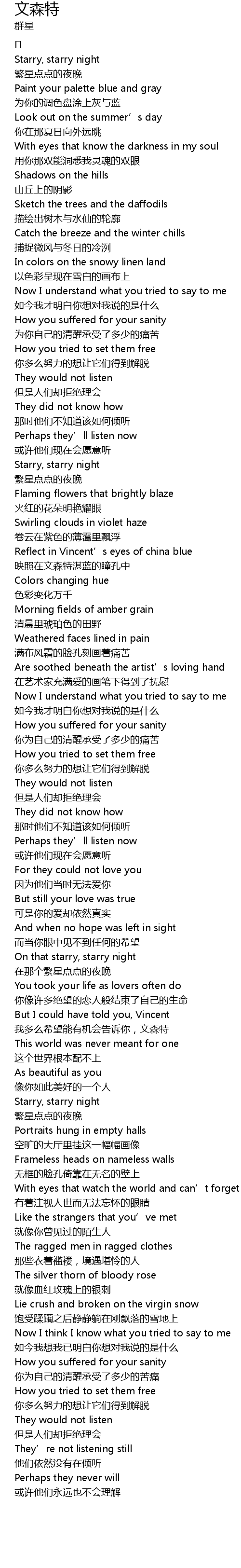 | [01:41.263] | Reflect in Vincent’s eyes of china blue 映照在文森特湛蓝的瞳孔中 |