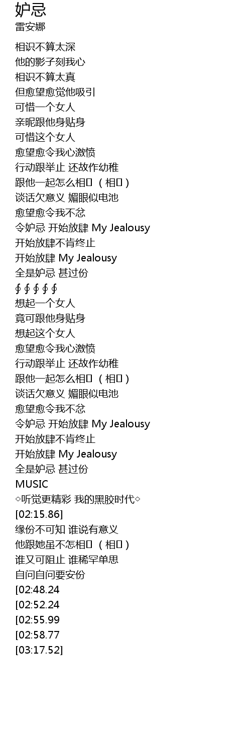 | [03:03.97][02:48.24][02:34.03] | 令妒忌 终止放肆 My Jealousy |