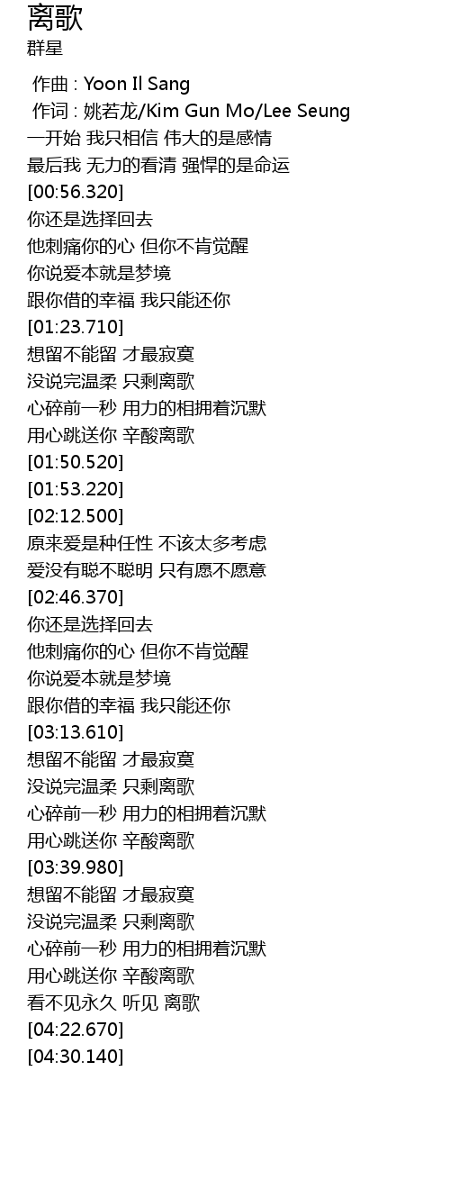 | [00:01.00] | zuo ci : yao ruo long Kim Gun Mo Lee Seung |