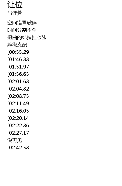 | [01:19.01][02:27.17] | 我让位 |