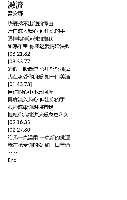 | [04:09.16][03:21.82][00:56.51] | 心里一股激流 使我深深感受 |