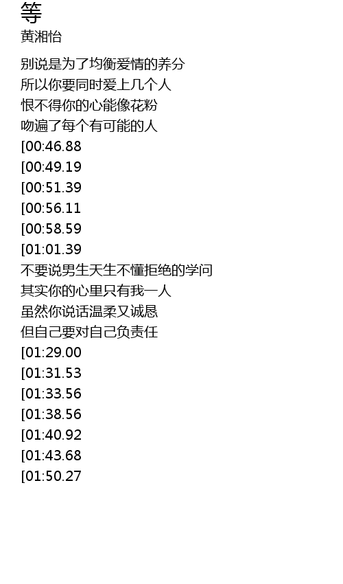 | [02:06.81][00:49.19] | wǒ nài xīn de děng děng děng le yòu děng |