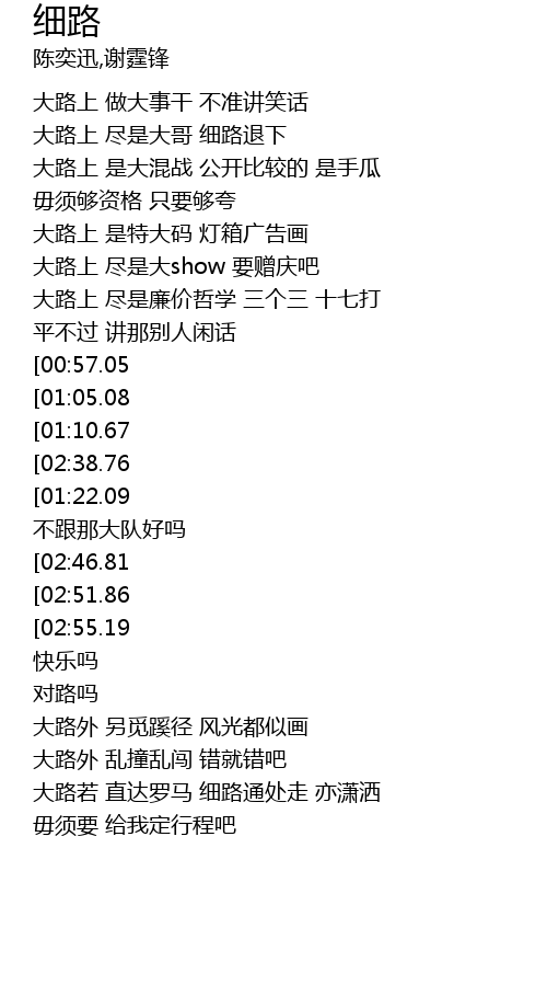 | [02:32.73][01:10.67] | 大路要是太迫来吧 |