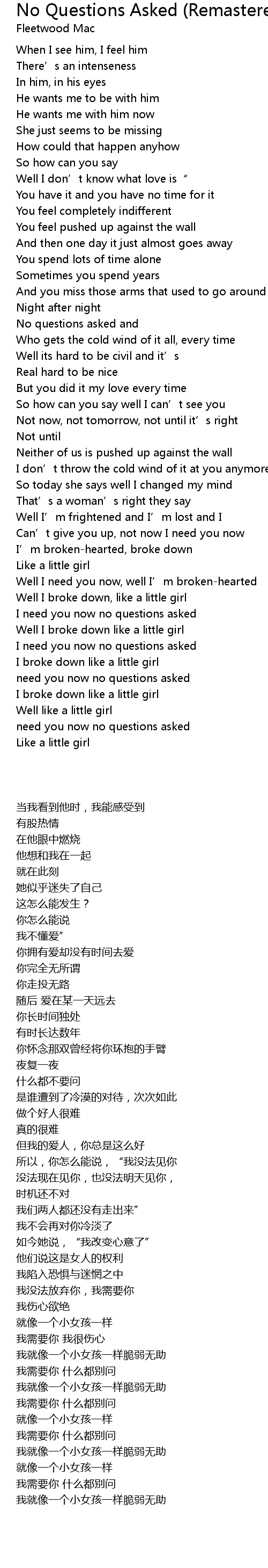 | 歌曲 | No Questions Asked (Remastered Version) |