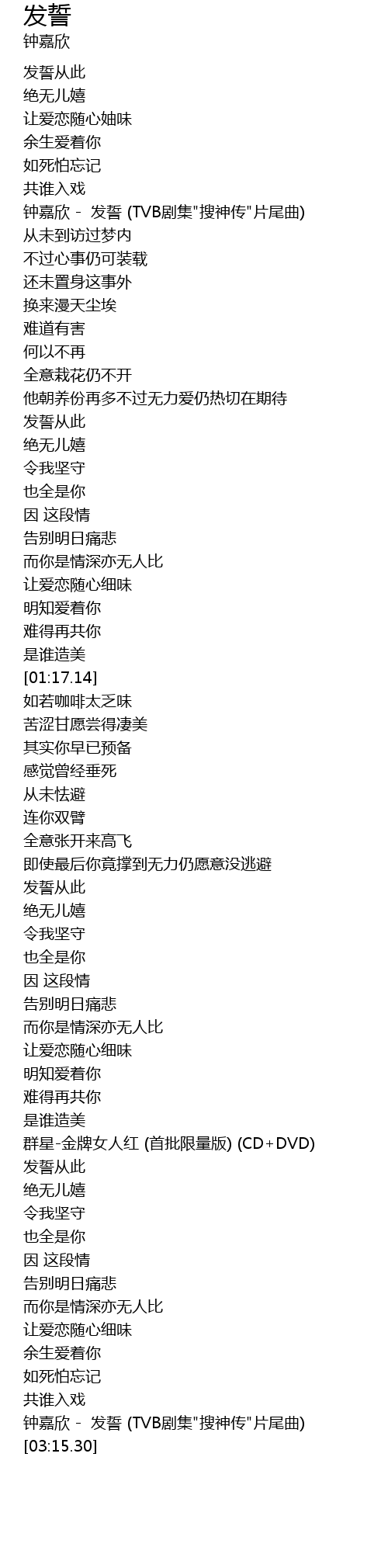 | [00:15.30] | 钟嘉欣 - 发誓 (TVB剧集"搜神传"片尾曲) |