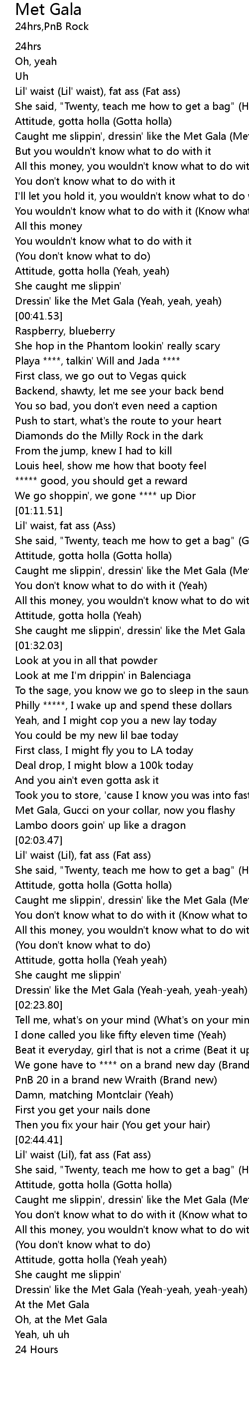 | [00:18.28] | Caught me slippin', dressin' like the Met Gala (Met) |