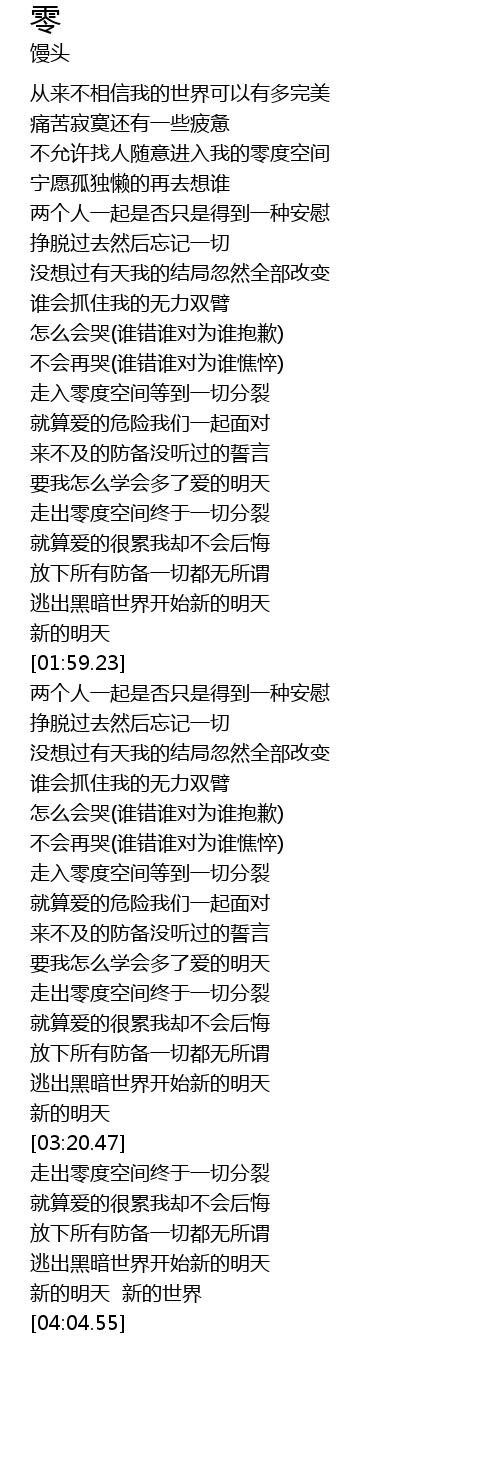 | [01:36.67] | 走出零度空间终于一切分裂 |