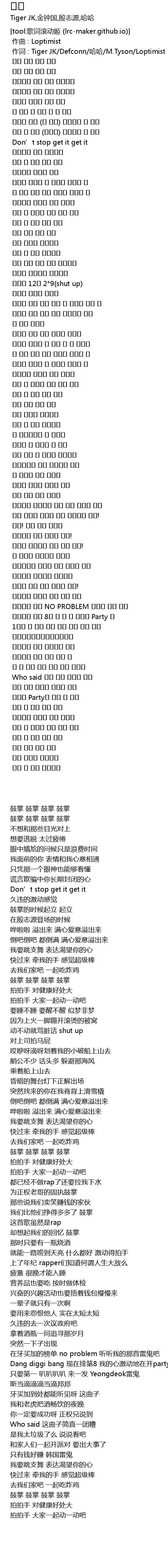 | [00:01.000] | 作词 : Tiger JK/Defconn/哈哈/M.Tyson/Loptimist |