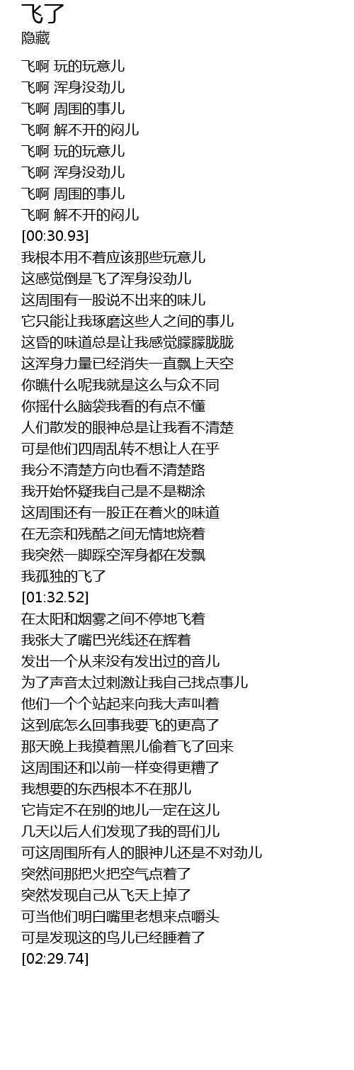 | [00:23.20] | 飞啊 浑身没劲儿 |
