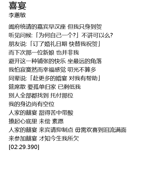 | [01:45.350] | 人家的囍宴 来宾请抑制点 毋需欢喜到泪流满面 |