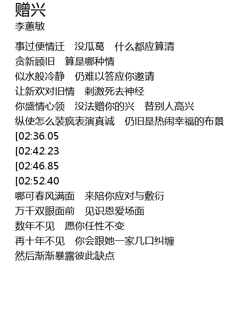 | [03:08.95][02:46.85][01:12.49] | 算什么情调 赠兴也许 慰寂寥 |