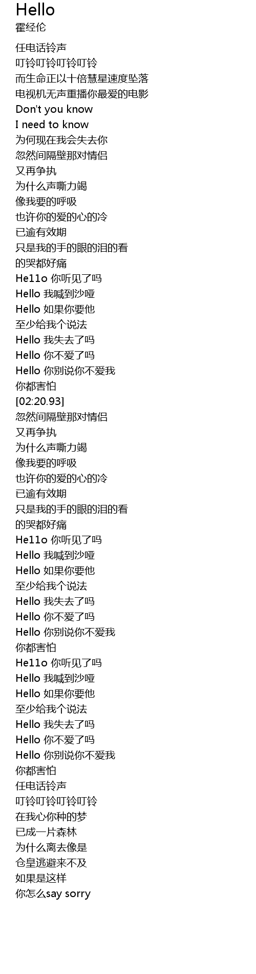| [01:48.60] | Hello nǐ bù ài le ma |