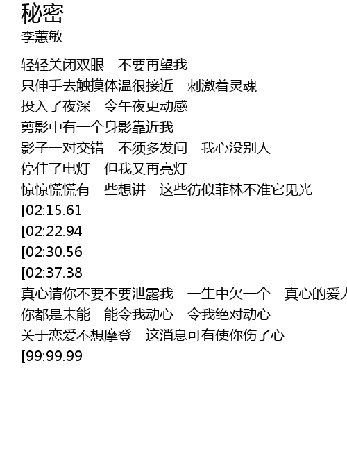 | [02:46.10][02:15.61][00:57.19] | 有个秘密秘密于心窝 从未从未谈论过 请相信我 |
