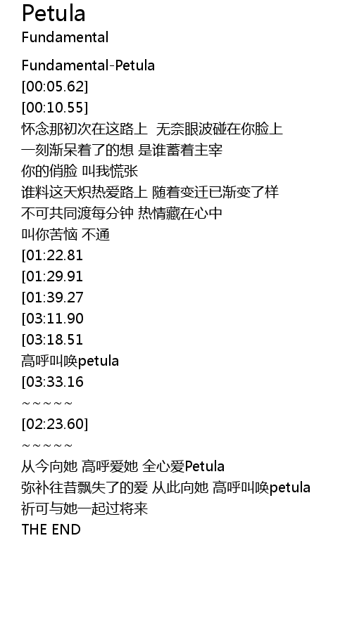 | [02:43.93][01:22.81] | 不要掉眼泪 无用顾虑 My pretty petula |