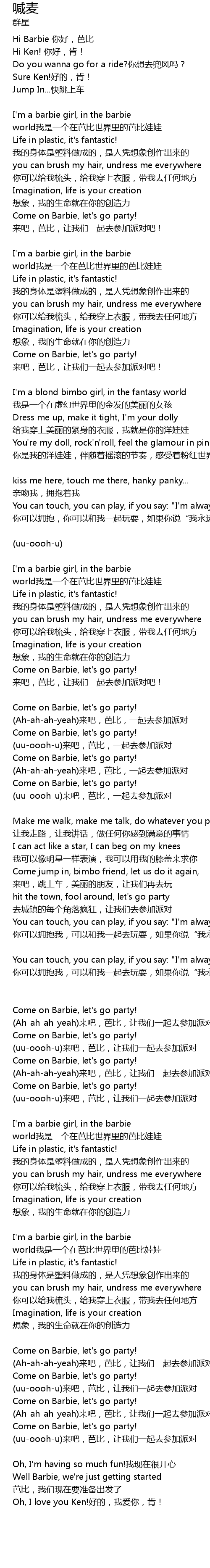 | I' m a barbie girl, in the barbie world wo shi yi ge zai ba bi shi jie li de ba bi wa wa | |