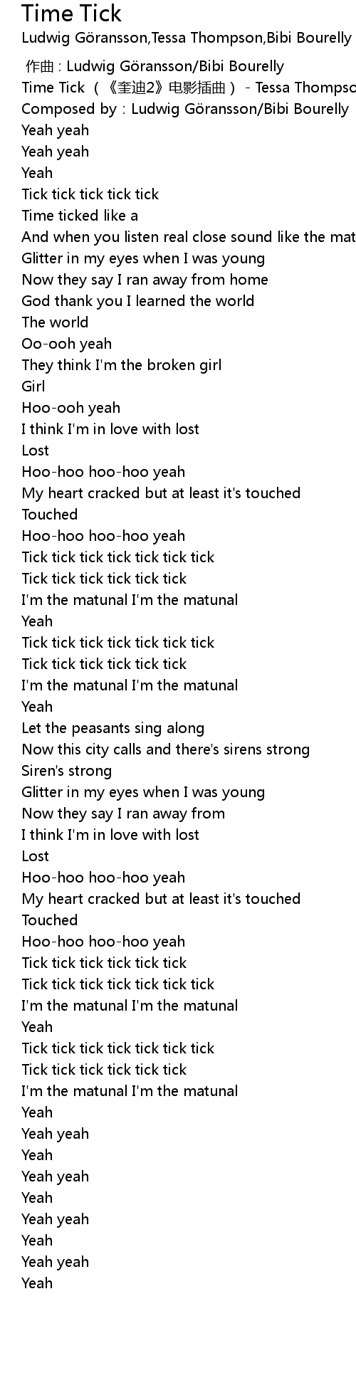| [00:00.100] | Time Tick kui di 2 dian ying cha qu Tessa Thompson |