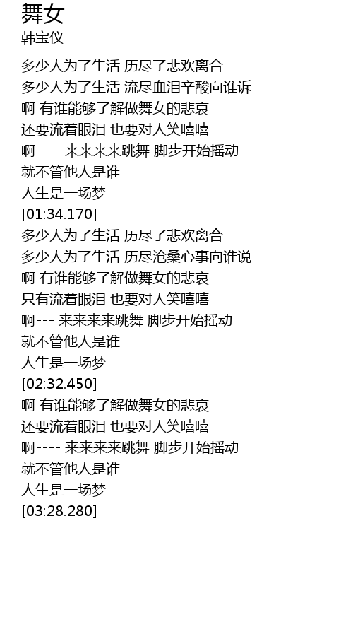 | [03:02.280] | 啊 有谁能够了解做舞女的悲哀 |